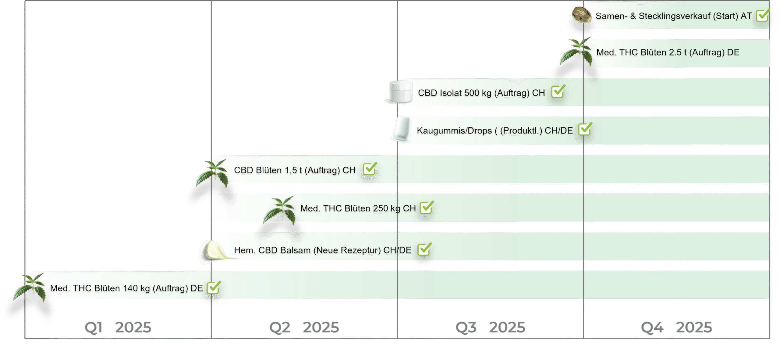 Wir besitzen alle notwendigen Lizenzen für den Anbau von THC-haltigem Cannabis und sind auf Qualitätssicherung nach GACP-Standards fokussiert. Unsere Umsatzprognosen zeigen ein stark wachsendes Geschäft mit einem Break-Even im Q2 2026 und einem Umsatz von 12,3 Millionen CHF bis 2028.